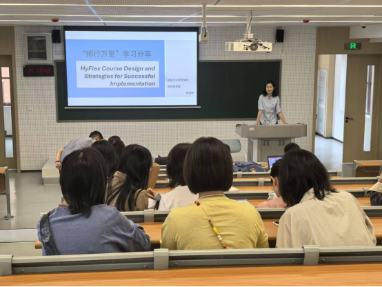 2025年9月18日,我院教师肖达娜以HyFlex Course Design and Strategies for Successful Implementation为题,与全院教师分享了她在“师行万里”教师海外研修项目中的学习经验,共同探讨人工智能环境下混合式教学的实施路径与前沿思考。肖老师从HyFlex课程的基本理念出发,系统阐释了其核心优势,包括:支持通用学习设计,提供参与、表征与表达的多重选择;增强学习自主性与可及性;提升教育连续性与资源利用效率;推动教师技术整合与课程设计能力发展。同时,她也客观分析了HyFlex模式面临的挑战,如教学管理复杂度高、异步学习者体验差异、课堂互动局限及技术公平等问题。