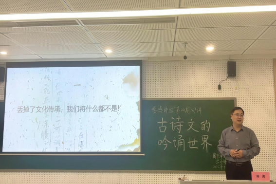 随后,陈洪以“古人是怎么读书的”切入正题。通过两段珍贵的视频材料,系统阐释“自古读书皆吟诵”的历史事实,指出在百年以前,没有一个中国人会朗诵,所有中国文人都是吟诵的。在此基础上,他介绍了何为吟诵,进一步辨析了吟诵与歌唱、吟诵与朗诵的本质区别,指出吟诵具有即兴、简单多化、与音乐性等特点。值得一提的是,陈洪还特别回顾了叶嘉莹先生在呼吁抢救与保护吟诵传统方面所做出的重要贡献,强调正是这样的努力使吟诵在当代重现生机。