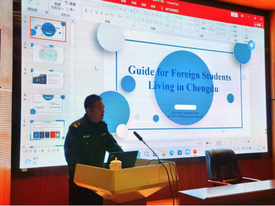 成都市公安局交管三分局二中队中队长陈思鸿警官以“在中国,你安全出行吗?”为主题,详细介绍了中国与国外交通规则的差异,包括通行方向、驾驶机动车与非机动车的注意事项,以及行人安全要点。他强调了遵守交通规则的重要性,提醒国际学生注意交通安全,确保出行平安。