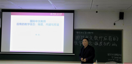 在核心内容分享环节,李泉教授围绕“国际中文教师的教学信念具体方法观”展开详细论述。目标观要求要以“语言交际能力”为核心,在实践中通过教学活动落实,而非仅停留于理念。语言观强调语言是“交际工具”,李泉教授批判了将语言当作“知识体系”的教学倾向,提出应将语言视为工具的观念。学生观强调要理性看待汉语学习者的水平与能力,教师需秉持“永远不要高估学习者汉语水平,永远不要低估其认知能力”的信念,教师观重在做平等的引导者与合作者,跨文化教学中,教师应摒弃“高高在上”的姿态,以“职业者身份”施教。方法观“因境取法”,以本体知识为基,教学方法并非万能,需“因学生、因内容、因情境”灵活取舍。汉语观则要求我们要理性看待汉语的“难易”,教材观则明确指出,“教材只是媒介,而非权威”,语法观告诉我们“用法就是语法”,语音观指出“一失音成千古恨”,词汇观注重在语句中扩展词汇,汉字观则是对“字”“语”双重属性同步推进的突出等。李泉通过以上教学信念的讲解,再次重申了国际中文教育者应遵循汉语汉字及其作为二语教学的特点,探寻和凝练教学信念与教学方法,而不是一味盲崇拼音文字二语教学理论与方法。